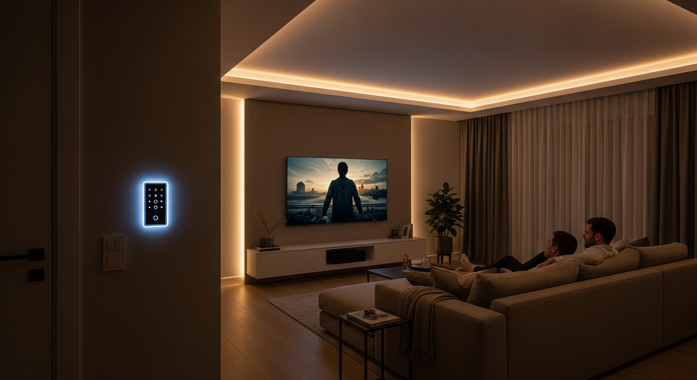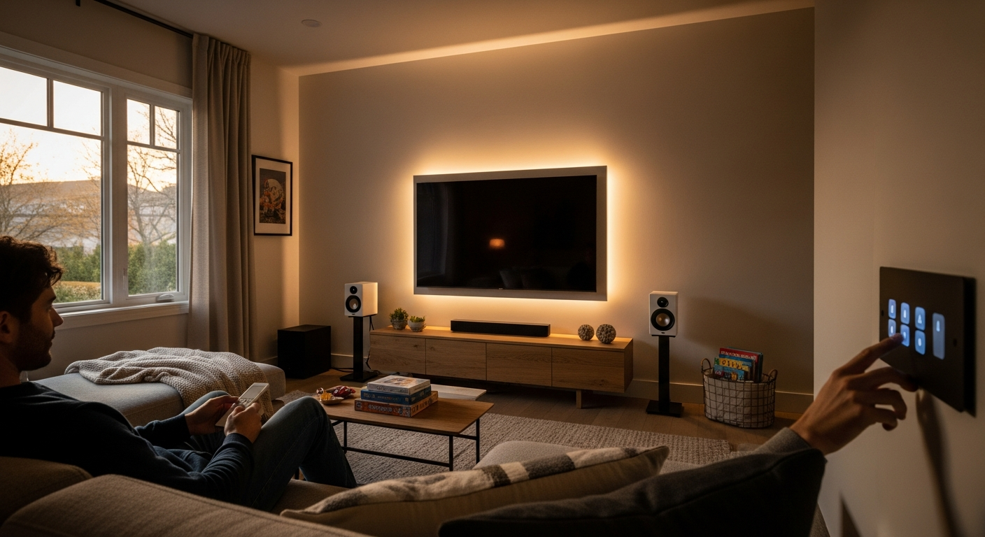 Behind the scenes, the system connects lighting, audio, displays, and sometimes shades or temperature into a single command. You activate it using a wall keypad, remote, or mobile app. The process feels instant and natural.